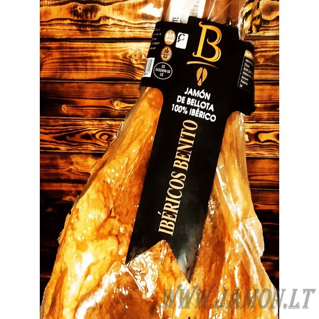 Хамон Iberico de Bellota вяленый иберийской породы 100% свиной окорок иберико (задняя нога) - это окорок из черной свинины высшего сорта, богатый дубовыми желудями, которые придают ветчине насыщенный вкус. Этот исключительно деликатесный продукт узнаваем по вытянутой форме, темному копытцу и розовому мясу с белыми полосками. Это проникновение жира заставляет каждый кусочек таять во рту.